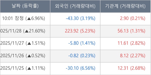 [서울=뉴스핌] 로보뉴스 = 01일 10시 15분 현재 고영(098460)은 전일 대비 6.96% (현재가 25,350원) 상승했고, 기관이 최근 7일 연속 순매수(누적 113.32만 주, 잠정) 행진을 하고 있다.