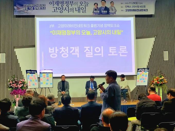 출범 기념 정책토크쇼에서 한 방청객이 질의하고 있다. [사진=고양미래비전네트워크] 2025.12.01 atbodo@newspim.com