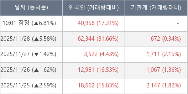 [서울=뉴스핌] 로보뉴스 = 01일 10시 15분 현재 솔트룩스(304100)는 전일 대비 6.81% (현재가 31,350원) 상승했고, 외국인이 최근 9일 연속 순매수(누적 24.98만 주, 잠정) 행진을 하고 있다.