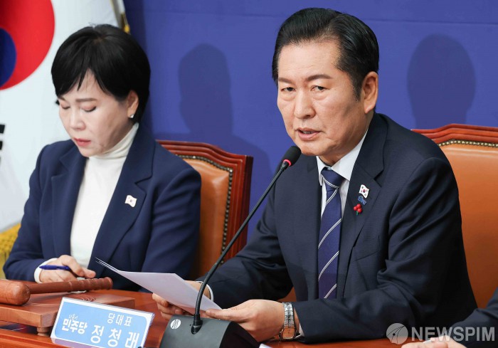 [서울=뉴스핌] 윤창빈 기자 = 정청래 더불어민주당 대표가 1일 서울 여의도 국회에서 열린 최고위원회의에서 모두발언을 하고 있다. 2025.12.01 pangbin@newspim.com