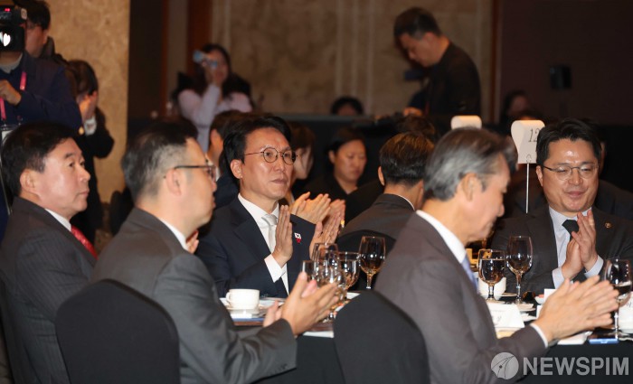 [서울=뉴스핌] 청사사진기자단 = 김민석 국무총리가 1일 오전 서울 중구 소공동 롯데호텔에서 열린 제11회 중견기업인의 날 기념식에서 중견기업 회장 기념사에 박수하고 있다. 2025.12.01 photo@newspim.com