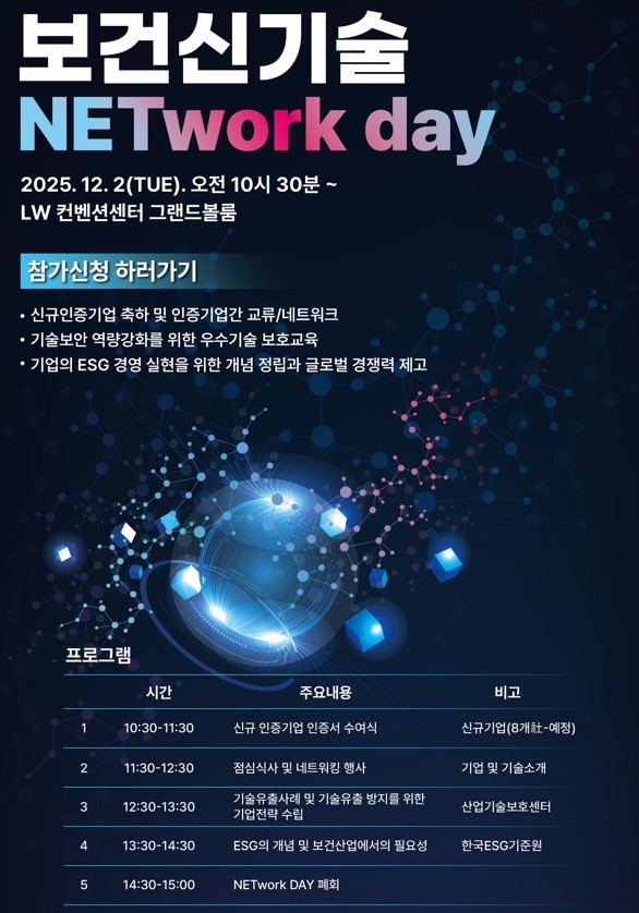 [세종=뉴스핌] 신도경 기자 = 국내 우수 기술력을 갖춘 기업들이 한자리에 모여 성과와 경험을 공유하는 '보건신기술 NETwork day'가 개최된다.