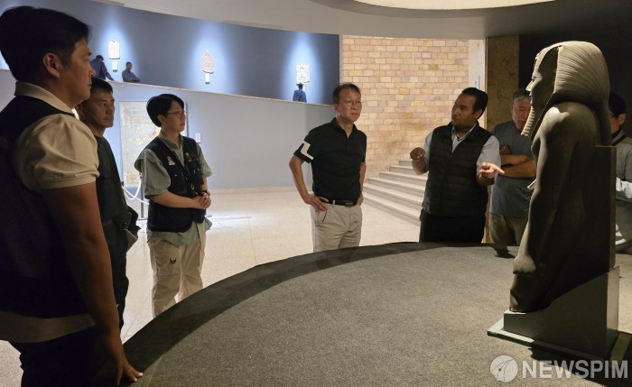 [서울=뉴스핌] 최보근 국가유산청 차장(가운데)이 30일 오후(현지 시간) 이집트 룩소르 소재 룩소르박물관을 방문해 알라 멘샤위 이집트 최고유물위원회 소속 룩소르박물관장(오른쪽)에게 유물 설명을 듣고 있다.(현지 시간) 이집트 룩소르 소재 룩소르박물관을 방문해 알라 멘샤위 이집트 최고유물위원회 소속 룩소르박물관장(왼쪽) 등 관계자들과 공적개발원조 사업 추진 방향을 논의하고 있다. [사진=국가유산청] 2025.12.01 photo@newspim.com