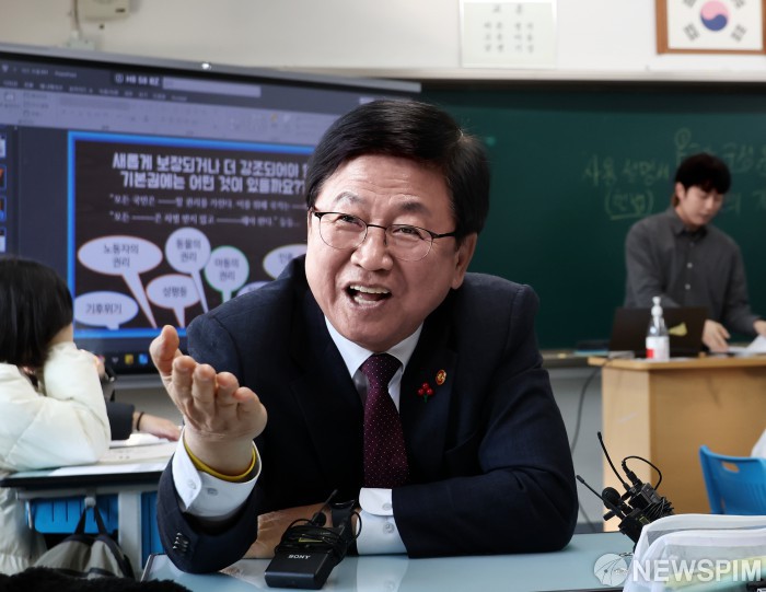 [서울=뉴스핌] 최교진 교육부 장관이 1일 오전 서울 관악구 난우중학교에서 헌법 수업 참관을 하며 학생들과 대화를 나누고 있다. [사진=교육부] 2025.12.01 photo@newspim.com