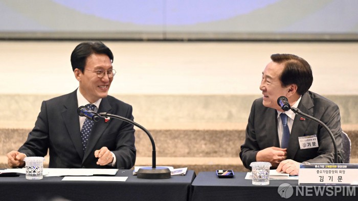 [서울=뉴스핌] 청사사진기자단 =김민석 국무총리와 김기문 중소기업중앙회 회장이 1일 오후 서울 여의도 중소기업중앙회에서 열린 중소기업 규제합리화 현장대화에서 대화를 하던 중 미소를 짓고 있다. 2025.12.01 photo@newspim.com