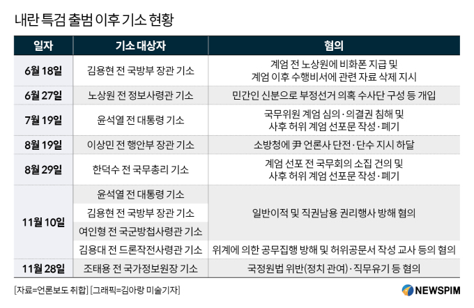 또한 수사 막바지에 들어선 내란특검팀은 막판 고삐를 당기며 지난달 28일 조태용 전 국가정보원장을 구속기소했다. 이어 박성재 전 법무부 장관과 추경호 전 국민의힘 원내대표(국미의힘 의원)에 대해서는 내란중요임무종사 혐의로 수사를 진행 중이다. 추경호 의원은 2일 구속 전 피의자 심문(영장실질심사)을 앞두고 있다. 이 외에도 황교안 전 국무총리, 이완규 전 법제처장에 대해서도 수사가 이어지고 있다.