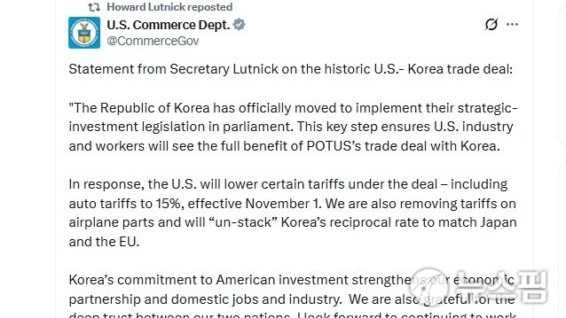 러트닉 장관은 이날 소셜미디어 플랫폼 엑스(X)에 올린 성명을 통해 "한국이 국회에서 자국의 전략적 투자 관련 입법을 공식적으로 추진하기 시작했다"며 "이 중요한 조치는 미국 산업과 노동자들이 한·미 무역협정의 혜택을 온전히 누릴 수 있게 할 것"이라며 이같이 밝혔다. 러트닉 장관은 이어 미국이 11월 1일부터 소급해 한국산 자동차에 대한 관세를 15%로 낮추고, 항공기 부품에 대한 관세를 철폐할 예정이라고 덧붙다. 또 한국의 상호 관세율을 일본 및 유럽연합(EU)과 동일한 수준으로 맞출 것이라고 밝혔다.