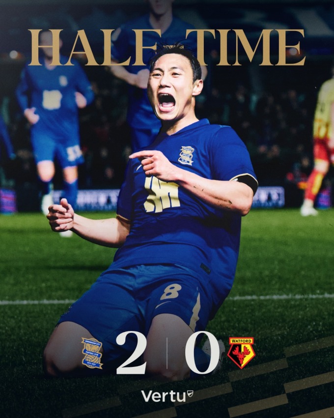 [서울=뉴스핌] 장환수 스포츠전문기자= 2일 왓퍼드와 홈 경기에서 백승호의 선제골을 앞세워 전반을 2-0으로 앞선 버밍엄. [사진=버밍엄시티] 2025.12.02 zangpabo@newspim.com