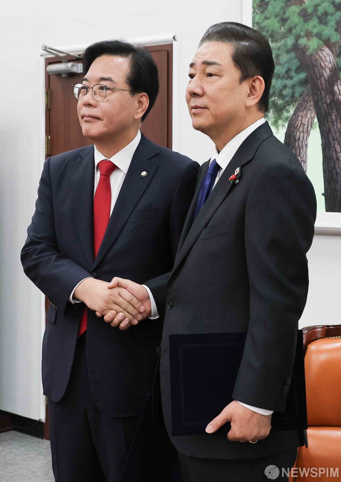 [서울=뉴스핌] 윤창빈 기자 = 김병기 더불어민주당 원내대표, 송언석 국민의힘 원내대표, 가 2일 서울 여의도 국회에서 2026년도 예산안 처리를 위한 합의문에 서명을 마치고 기념촬영을 하고 있다. 2025.12.02 pangbin@newspim.com