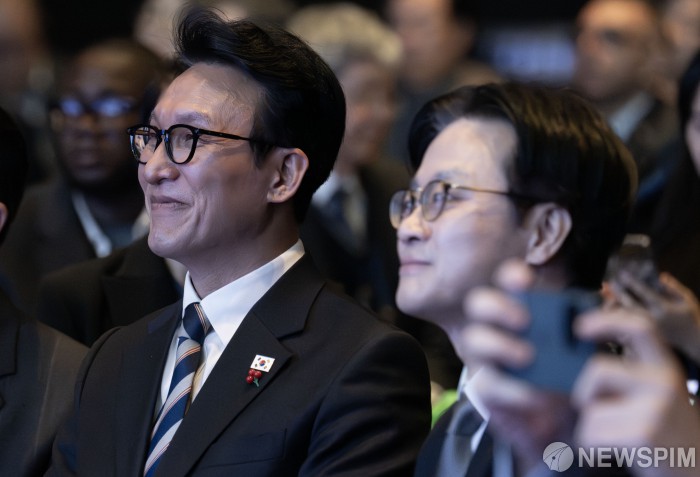 [서울=뉴스핌] 청사사진기자단 = 김민석(왼쪽) 국무총리와 김정관 산업통상자원부 장관이 2일 오전 서울 중구 신라호텔 다이너스티홀에서 열린 2025 국제 AI 표준 서밋 개회식에 참석하고 있다.2025.12.02 photo@newspim.com .