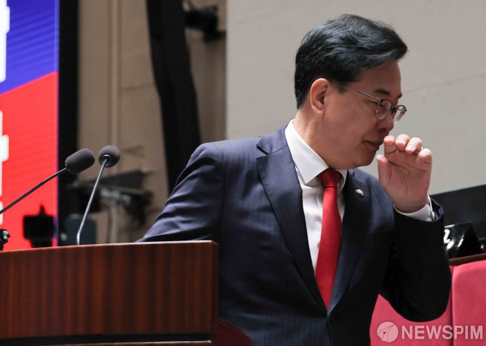 [서울=뉴스핌] 윤창빈 기자 = 송언석 국민의힘 원내대표가 2일 서울 여의도 국회에서 열린 의원총회에서 기침을 하고 있다. 2025.12.02 pangbin@newspim.com