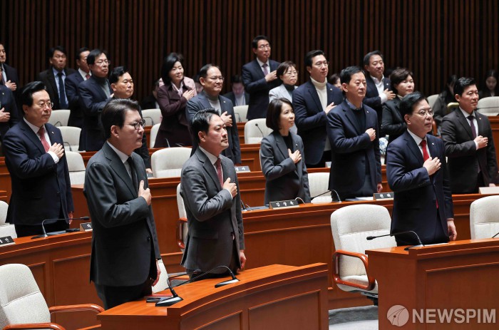 [서울=뉴스핌] 윤창빈 기자 = 장동혁 국민의힘 대표, 송언석 원내대표 등 소속 의원들이 2일 서울 여의도 국회에서 열린 의원총회에서 국민의례를 하고 있다. 2025.12.02 pangbin@newspim.com