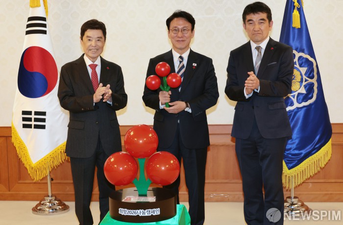 [서울=뉴스핌] 이길동 기자 = 김민석 국무총리 2일 서울 종로구 정부서울청사에서 열린 사랑의 열매 성금 전달식에서 김병준 사회복지공동모금회 회장으로부터 사랑의 열매 모형을 전달 받은 후 기념촬영을 하고 있다. 왼쪽부터 김병준 사회복지공동모금회 회장, 김 총리, 황인식 사무총장. 2025.12.02 gdlee@newspim.com
