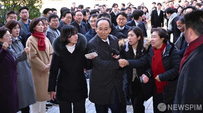 | [서울=뉴스핌] 최지환 기자 = 추경호 국민의힘 의원이 2일 서울 서초구 서울중앙지방법원에서 열린 구속 전 피의자 심문(영장실질심사)에 출석하며 국민의힘 의원들의 응원을 받고 있다. 2025.12.02 choipix16@newspim.com |