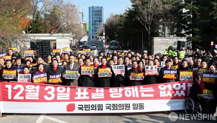 송언석 원내대표는 "조작된 퍼즐로 끼워 맞춘 영장은 사실과 법리로 따지면 당연히 기각돼야 한다"며 "야당 탄압 정치공작에 사즉생의 각오로 맞서면서 대한민국의 법치주의와 자유민주주의를 지켜내겠다"고 강조했다.
