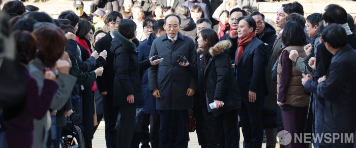 [서울=뉴스핌] 최지환 기자 = 국회의 12·3 비상계엄 해제 의결 방해 의혹을 받는 추경호 전 국민의힘 원내대표가 2일 오후 서울 서초구 서울중앙지방법원에서 열린 영장실질심사(구속 전 피의자 심문)에 출석하고 있다. 2025.12.02 choipix16@newspim.com