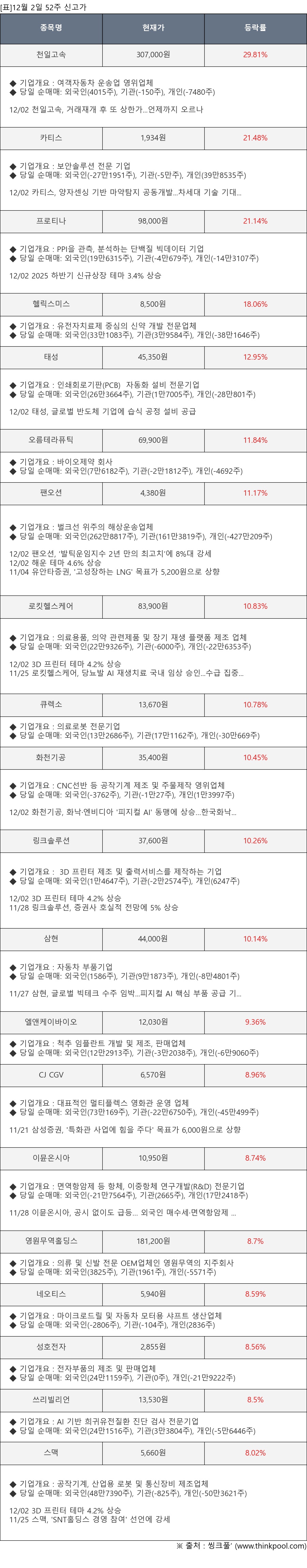 [표]12월 2일 52주 신고가 종목 및 최근 동향