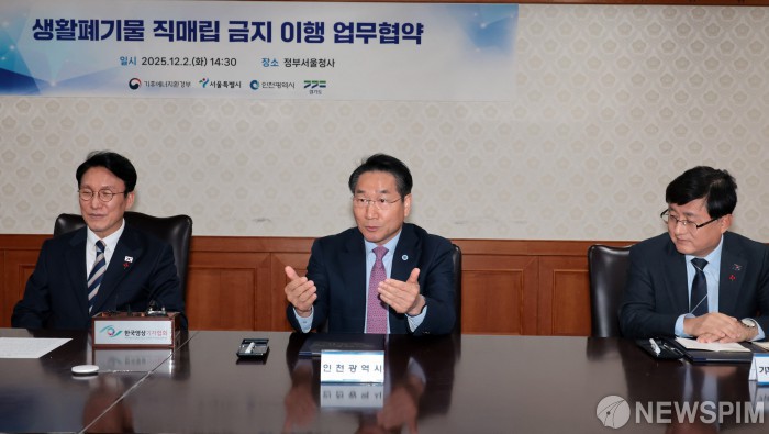 [서울=뉴스핌] 이길동 기자 = 유정복 인천광역시장(가운데)이 2일 서울 종로구 정부서울청사에서 열린 생활폐기물 직매립 금지 이행 업무협약식에서 발언하고 있다. 2025.12.02 gdlee@newspim.com