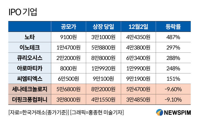 다만 상장 당일 급등세와 달리 이후, 주가가 공모가를 밑도는 종목도 나타나고 있다. 최근 조정을 받은 일부 종목은 공모가 대비 평균 약 9% 낮은 수준에서 거래되고 있으며, '세나테크놀로지'와 '더핑크퐁컴퍼니'가 대표적인 사례로 꼽힌다.