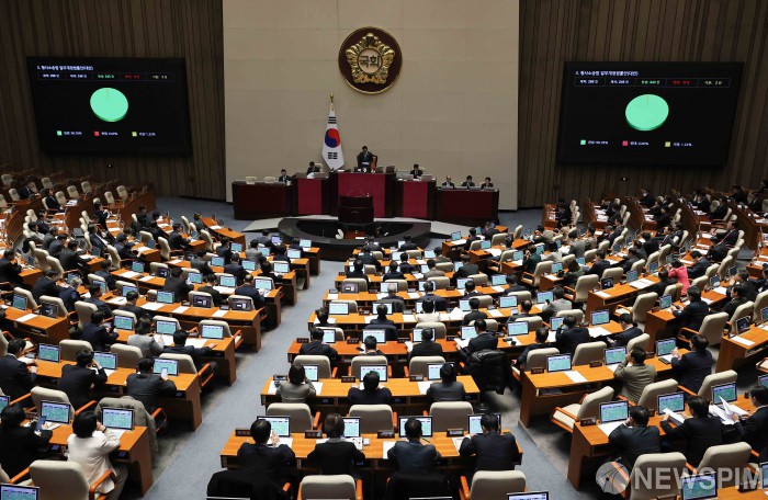 [서울=뉴스핌] 윤창빈 기자 = 2일 서울 여의도 국회에서 본회의에서 형사소송법 일부개정법률안(대안)이 가결되고 있다. 2025.12.02 pangbin@newspim.com