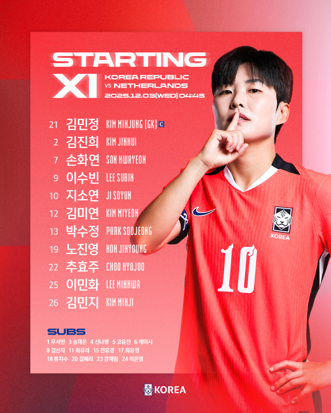 | [서울=뉴스핌] 장환수 스포츠전문기자= 네덜란드전 선발 출전 명단. [사진=대한축구협회] 2025.12.03 zangpabo@newspim.com |