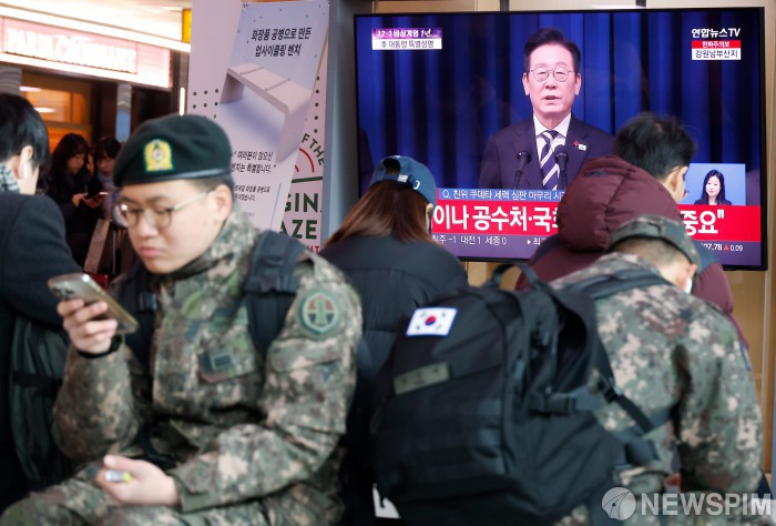 [서울=뉴스핌] 류기찬 기자 = 12·3 비상계엄 1주년인 3일 오전 서울역 대합실에서 시민들이 이재명 대통령의 대국민 특별성명 발표를 시청하고 있다. 2025.12.03 ryuchan0925@newspim.com