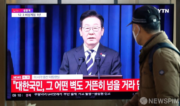 [서울=뉴스핌] 류기찬 기자 = 12·3 비상계엄 1주년인 3일 오전 서울역 대합실에서 시민들이 이재명 대통령의 대국민 특별성명 발표를 시청하고 있다. 2025.12.03 ryuchan0925@newspim.com
