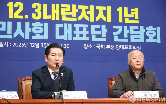 [서울=뉴스핌] 김학선 기자 = 12·3 비상계엄 사태 1년을 맞은 3일 서울 여의도 국회에서 열린 '더불어민주당 12·3 내란 저지 1년 시민사회 대표단 간담회'에서 정청래 대표가 발언하고 있다. 2025.12.03 yooksa@newspim.com