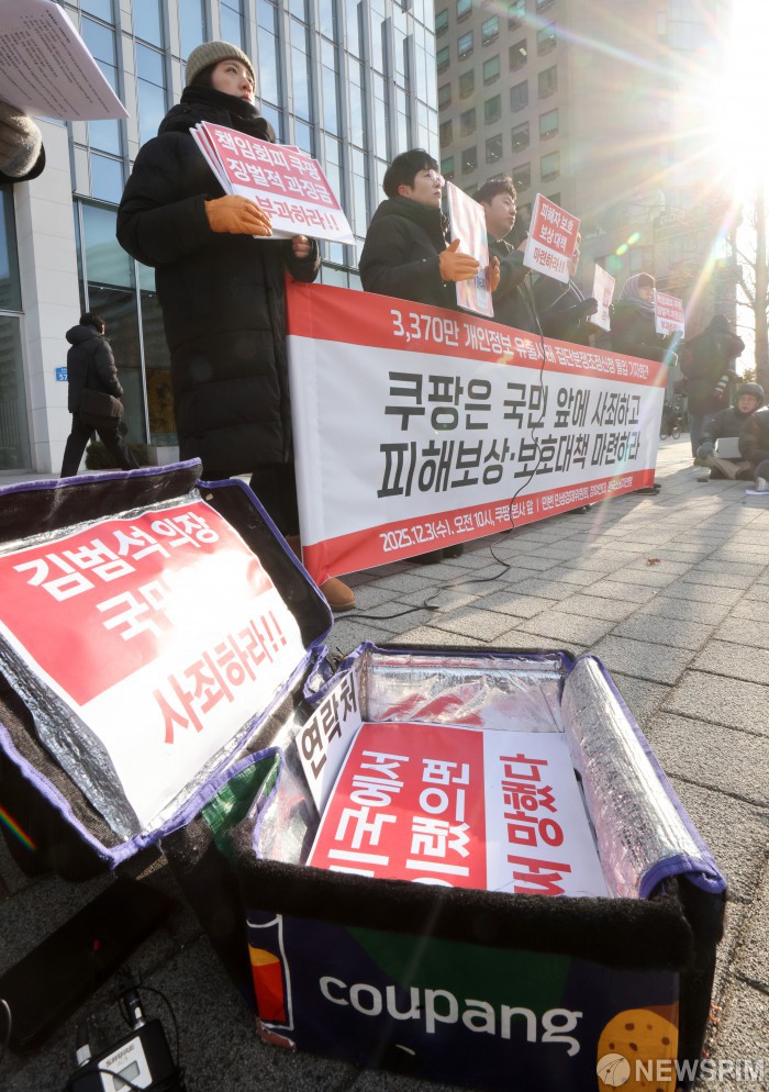 [서울=뉴스핌] 최지환 기자 = 3일 오전 서울 송파구 쿠팡 본사 앞에서 민병 민생경제위원회, 참여연대, 한국소비자연맹이 주최한 쿠팡 개인정보 유출 집단분쟁조정 신청 돌입 기자회견이 열리고 있다. 2025.12.03 choipix16@newspim.com