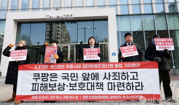 [서울=뉴스핌] 최지환 기자 = 3일 오전 서울 송파구 쿠팡 본사 앞에서 민병 민생경제위원회, 참여연대, 한국소비자연맹이 주최한 쿠팡 개인정보 유출 집단분쟁조정 신청 돌입 기자회견에서 참가자들이 구호를 외치고 있다. 2025.12.03 choipix16@newspim.com