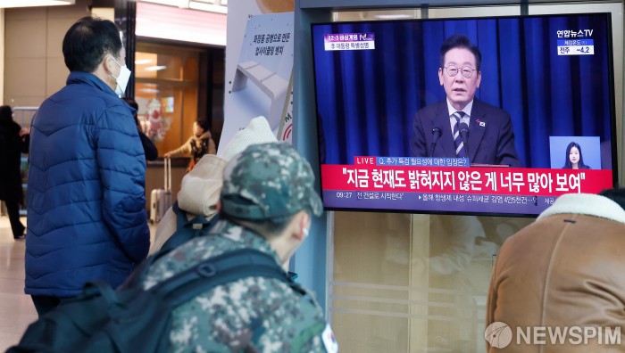 | [서울=뉴스핌] 류기찬 기자 = 12·3 비상계엄 1주년인 3일 오전 서울역 대합실에서 시민들이 이재명 대통령의 대국민 특별성명 발표를 시청하고 있다. 2025.12.03 ryuchan0925@newspim.com |