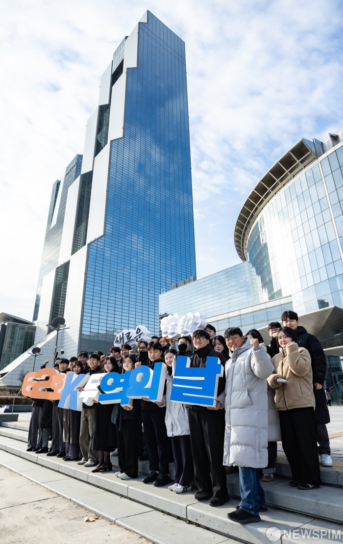 [서울=뉴스핌] 법정기념일인 '무역의 날' 62주년을 앞두고 서울 강남구 코엑스 광장에서 한국무역협회 직원들이 올해 슬로건인 "K-무역, 새로운 길을 열다"를 들고 기념촬영을 하고 있다. [사진=한국무역협회] 2025.12.03 photo@newspim.com