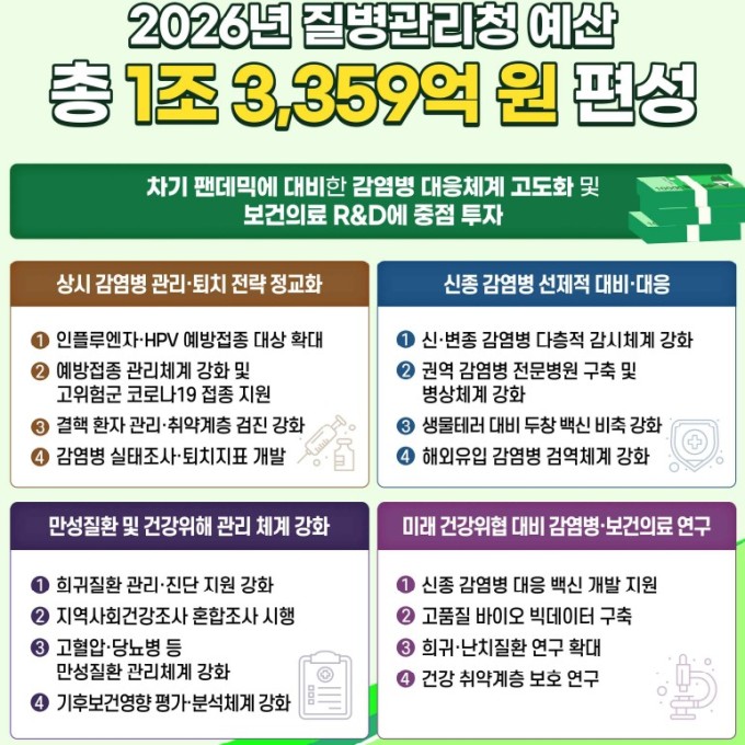 질병관리청은 지난 2일 국회 의결을 거쳐 2026년도 예산이 2025년(1조2661억원) 예산 대비 698억원(5.5%) 증액된 1조3359억원으로 최종 확정됐다고 3일 밝혔다.