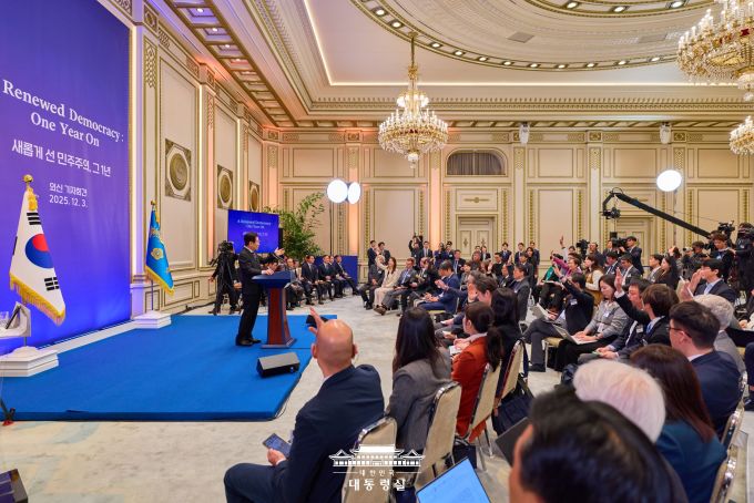 | 이재명 대통령이 3일 청와대 영빈관에서 12·3 비상계엄 1년을 맞아 '민주주의 회복 1년 계기' 외신 기자회견을 하고 있다. [사진=대통령실] |