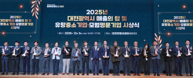 [대전=뉴스핌] 오영균 기자 = 대전시는 3일 유성구 도룡동 대전컨벤션센터 제1전시관에서 '2025년 매출의 탑 및 유망중소기업·모범명문기업 시상식'을 개최했다고 밝혔다.