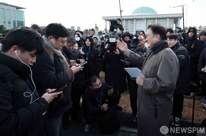 [서울=뉴스핌] 윤창빈 기자 = 우원식 국회의장이 3일 서울 여의도 국회에서 열린 '비상계엄 해제 1주년 기억행사' 다크투어에서 도슨트로 참여해 시민들과 함께 계엄군이 들이닥쳤던 국회 1문을 돌아보고 있다. 2025.12.03 pangbin@newspim.com