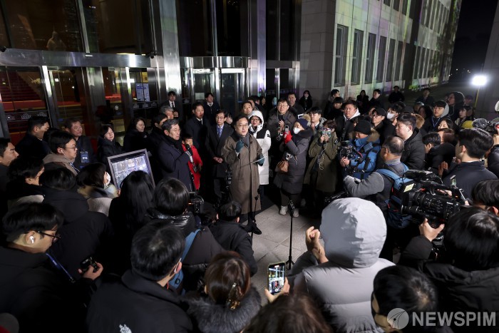 [서울=뉴스핌] 김학선 기자 = 우원식 국회의장이 3일 오후 서울 여의도 국회에서 열린 '그 날 12.3 다크투어' 중 정현관 앞에서 발언하고 있다. 2025.12.03 yooksa@newspim.com