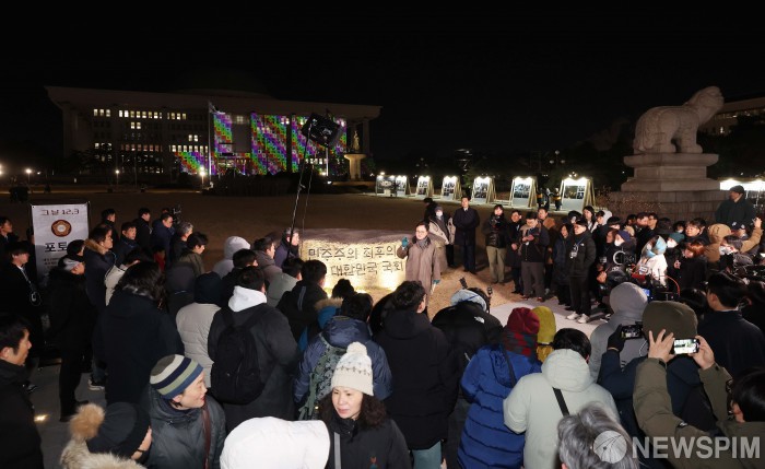 [서울=뉴스핌] 김학선 기자 = 우원식 국회의장이 3일 서울 여의도 국회에서 열린 ‘그날 12.3 다크투어’에서 직접 도슨트로 나서 시민들에게 국회 상징석에 대해 설명하고 있다. 2025.12.03 yooksa@newspim.com