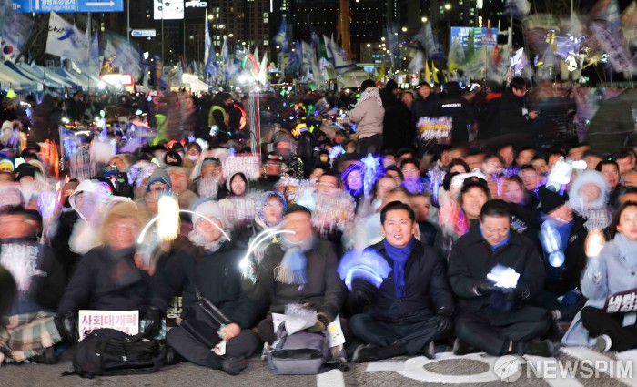[서울=뉴스핌] 윤창빈 기자 = 3일 서울 여의도 국회의사당 정문 앞에서 열린 12.3 내란외환 청산과 종식, 사회대개혁 시민대행진에서 시민들이 응원봉을 들고 구호를 외치고 있다. 2025.12.03 pangbin@newspim.com