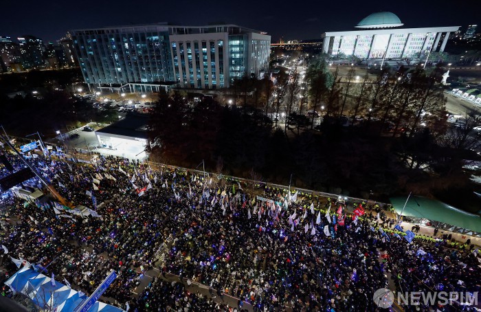 [서울=뉴스핌] 류기찬 기자 = 3일 오후 서울 여의도 국회의사당 정문 앞에서 '12·3 내란·외환 청산과 종식, 사회 대개혁 시민 대행진' 집회가 열리고 있다. 2025.12.03 ryuchan0925@newspim.com