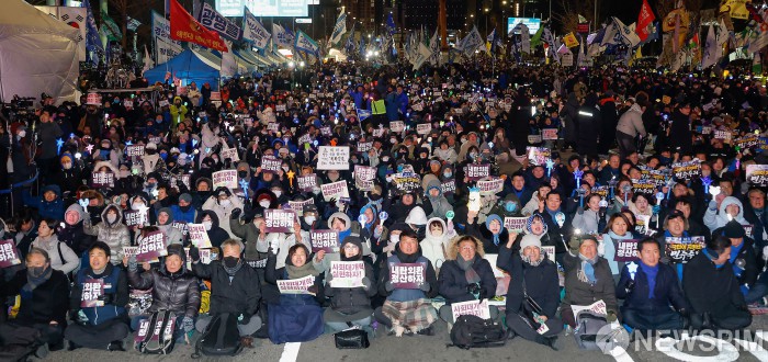 [서울=뉴스핌] 류기찬 기자 = 3일 오후 서울 여의도 국회의사당 정문 앞에서 열린 '12·3 내란·외환 청산과 종식, 사회 대개혁 시민 대행진‘ 집회에서 참가자들이 환호하고 있다. 2025.12.03 ryuchan0925@newspim.com
