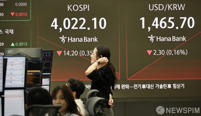 [서울=뉴스핌] 양윤모 기자 = 4일 오전 코스피가 전장 종가보다 14.20 포인트(0.35%) 하락하며 4022.10 으로, 코스닥은 2.06 포인트(0.22%) 상승한 934.07으로 장을 시작한 가운데, 서울 중구 하나은행 딜링룸에서 직원들이 업무를 보고 있다. 서울외환시장에서 달러/원 환율은 전장 대비 2.30원 하락한 1465.70원에 주간거래를 시작했다. 2025.12.04 yym58@newspim.com