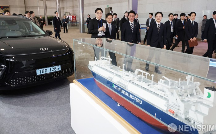 [서울=뉴스핌] 이길동 기자 = 김민석 국무총리가 4일 서울 강남구 코엑스에서 열린 '제62회 무역의 날 기념식'에 앞서 김정관 산업통상부 장관 , 윤진식 한국무역협회장과 함께 행사장 앞에 전시된 현대 전기차와 LNG선박을 둘러보고 있다.2025.12.04 gdlee@newspim.com