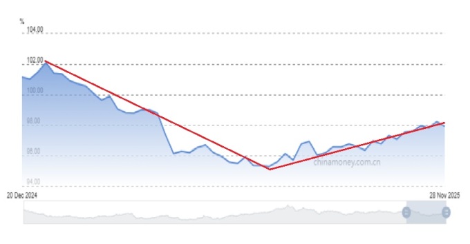 한편 11월말 현재 인민은행이 산출하는 위안화 인덱스(주요국 통화 바스켓 대비 위안의 가치 변동을 보여주는 인덱스)는 97.92를 기록, 연초 102.09에서 하락했다.