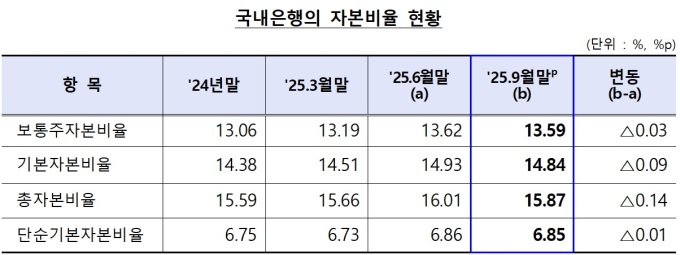 보통주자본비율은 13.59%로 0.03%p 떨어졌고 기본자본비율은 0.09%p 하락했다. 단순기본자본비율도 0.01%p 감소한 6.85%로 집계됐다.