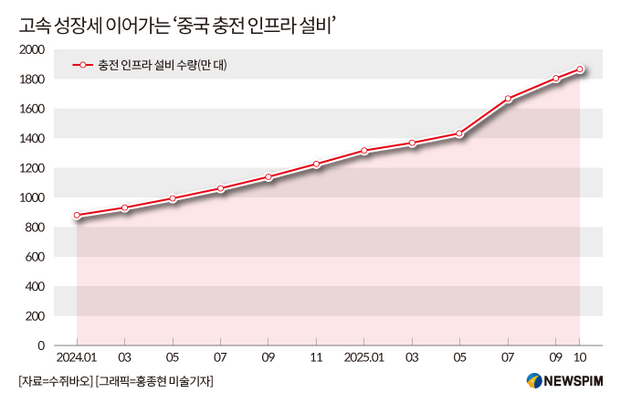 중국충전연합회의 데이터에 따르면 2025년 10월 말 기준 중국 전국에 들어선 전기차 충전 인프라 총수는 1864만5000 개로 전년 동기 대비 54% 증가했다. 그 중 공공 충전시설은 453만3000 개로 전년 대비 39.5% 증가했고, 공공 충전 총용량은 2억300만 kW에 달하는 것으로 집계됐다.