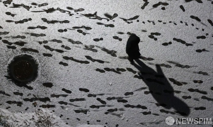 [인천=뉴스핌] 김학선 기자 = 서울 등 수도권에 첫눈이 내린 4일 밤 인천 계양구에서 한 시민이 눈 쌓인 길을 걷고 있다. 2025.12.04 yooksa@newspim.com