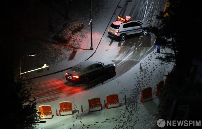 [서울=뉴스핌] 김정인 기자 = 올겨울 첫눈이 내린 4일 저녁 서울 곳곳에서 도로 결빙이 발생하며 차량 통제가 이어지고 있다.