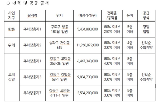 [서울=뉴스핌] 조수민 기자 = 서울주택도시개발공사(SH)는 항동·위례·고덕강일지구 내 주차장용지 5필지를 분양한다고 5일 밝혔다.