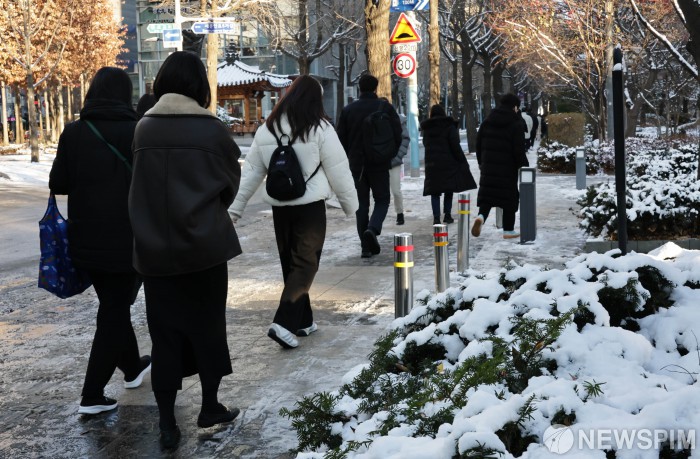 [서울=뉴스핌] 양윤모 기자 = 밤사이 내린 폭설과 한파로 도로 곳곳이 얼어붙은 5일 오전 서울 종로구 광화문에서 시민들이 출근을 하고 있다. 2025.12.05 yym58@newspim.com